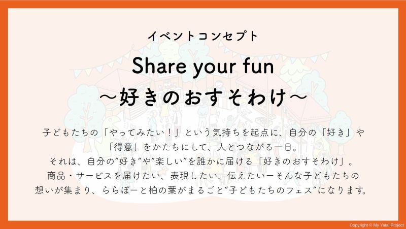 小中学生が自らの好きなことや得意なこと、 関心事から生まれたアイデアを人々に振る舞うことで 社会や誰かに貢献する喜びを体験するプロジェクト。ひらめきをもとに、商品やサービスをつくり、商業施設やマルシェ、お祭りなどに屋台を出します。大事にしているのは、「面白そう!」「思いついちゃった!」というワクワクの気持ち。子どもたちの発想を尊重し、自分で決めるプロセスを大切にしています。